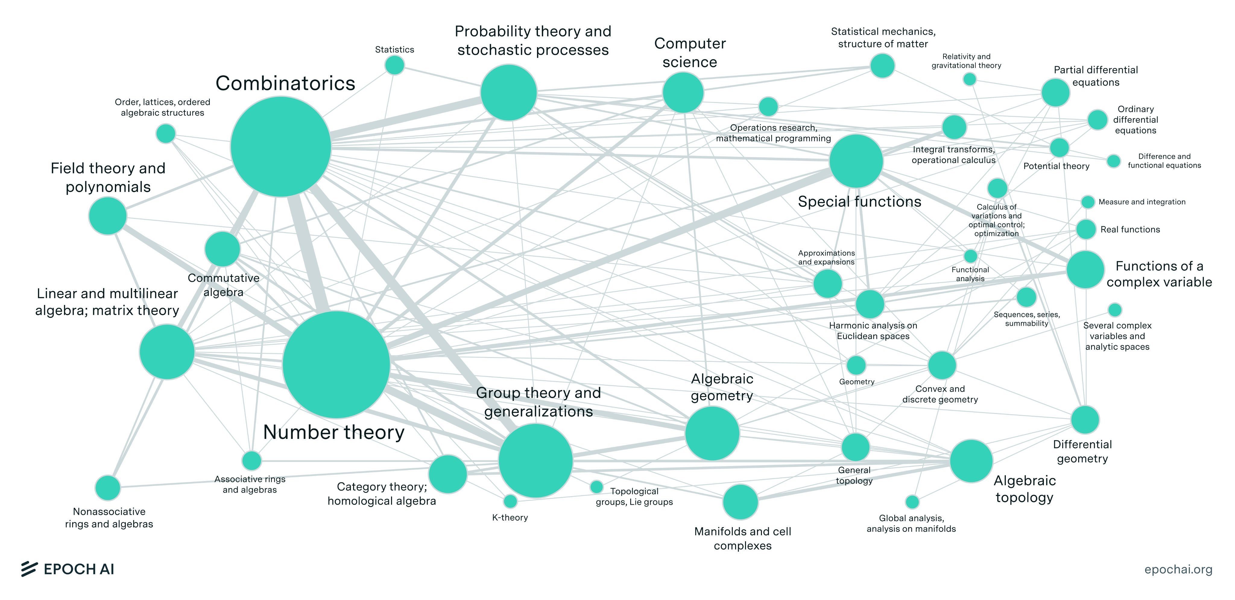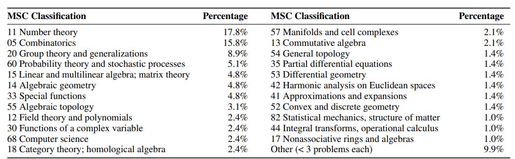 FrontierMath authos assign at least one MSC 2020 code to each problem to indicate its primary topic. The percentages you see represent how frequently each MSC code appears across the entire dataset. Essentially, if you slice up the collection of problems by mathematical “genre,” each slice’s percentage indicates how large a presence that particular area of math has within FrontierMath. This distribution also shows whether the dataset is broadly covering many areas (like number theory, analysis, etc.) or if it focuses heavily on just a few.